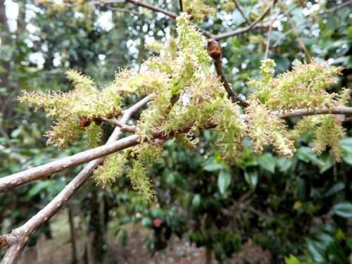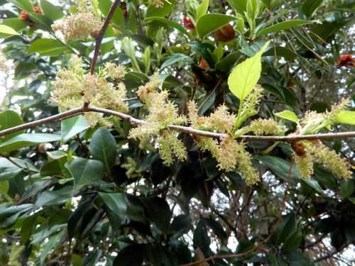 葉を見ると、樫や椎のそれのように厚いものではなく、落葉樹のような薄い葉である。ということで、ヤマグワの雄花ではないかと推定したが、確証がないので、「?」付きで掲載して置きます。​
