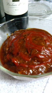 耐熱キャセロールに入れ、ドミグラスソースと赤ワイン、ケチャップなどを入れ
