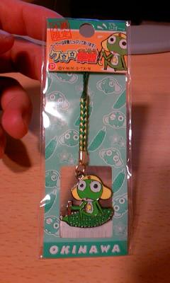 こんにちは ↑↑ 山口ブログに参加してます!! ↑↑ ブログ村へも参加します。 ちょっと二日酔いの中休日出勤してきました。 昨日一緒に飲んでた上司は来てませんでした(笑) で・・年末兄が帰って来た時にもらったストラップです。 沖縄限定のケロロストラップです。 沖縄好き!! ケロロ好きの侍にピッタリのストラップです!! (ケロロがゴ-ヤに乗っているところがサイコ~さ~!!) 裏面には 『にげ--!!であります』 って書いてあります。 この“であります”は山口弁です。 戦時中によく使われていた軍隊言葉の様です。 侍の父はよく電話で 『おはようありました!!』 訳:おはようございました って言います(笑) って事でひさびさに侍のケイタイにはストラップ付いてます。