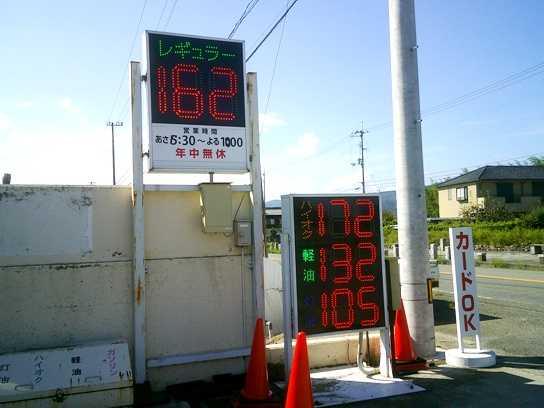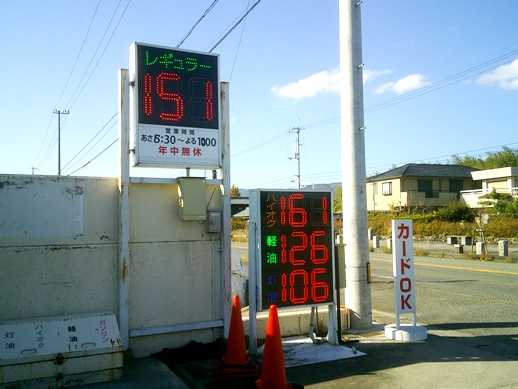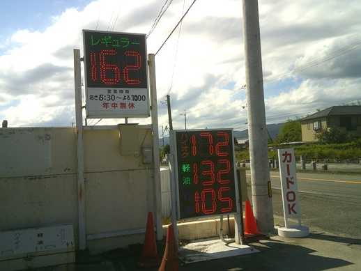 10月31日「本日のガソリン価格」今日は朝から終日雨、雨量も多く近所の畑では冠水してるところもある。本日のガソリン価格であるが、先月と変わらずの安定価格?ガソリンの旧暫定税率が12月31日に廃止が決まったようで、廃止までつなぎ措置が来月13日からあるとのこと。これでやっと少しは安くなりそうである。 手ぶれしてピンボケになった にほんブログ村にほんブログ村読んだ方はクリックを