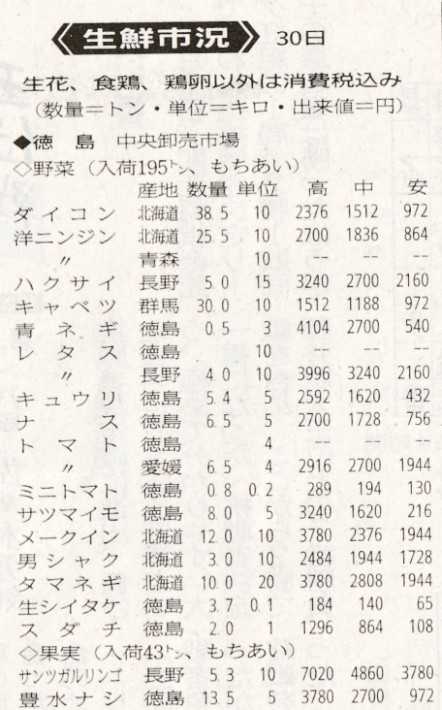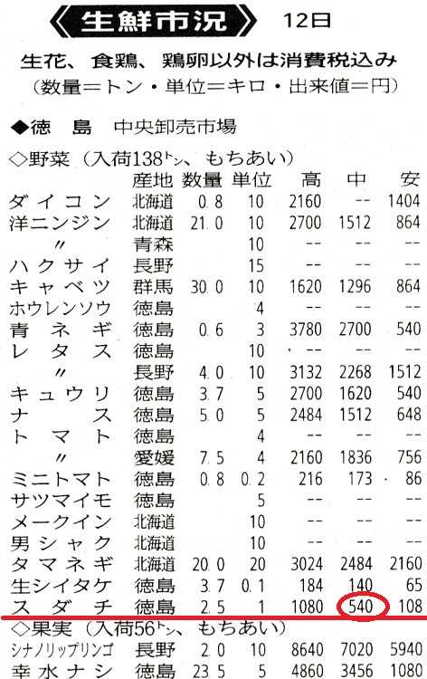 8月13日「青果市況」お盆休み前の昨日12日の青果市況。大きな相場変動は無く、この時期らしい相場となっている。ただ、地元産のスダチの相場でハウス物が終わり、露地のスダチが出だしたので大きく下げている。ここ2年ほど作柄が悪く不作で露地のスダチの価格は安定していたが、今年はどうだろうか。豊作の年は、盆が明けると中値で100円~200円の間を行き来していた。 にほんブログ村にほんブログ村読んだ方はクリックを