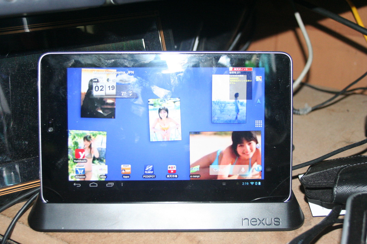2012/10/05にNexus7を買ってきた、その夜に予約注文した純正クレードルが、とうとう(やっと?)到着しました\(^_^)/…一応今日が発売日に決定したらしいけど。とりあえず外箱ビニールにくるまっているとかでなく、箱のなかにじかに入ってました前側にはNexusのロゴ後ろ側は、MicroUSBコネクターとオーディオ用の3.5ミリイヤホンジャックNexus7の側面と接続する端子乗っけたら、音声をホルダーに出力というダイアログが出ました(見えにくくてすいません(^^;)で、乗っけると確かにドックから音が出るし、出したまま取り外すとすぐに内蔵スピーカーに切り替わりますどうやって、4端子でUSBとオーディオを重畳させているんだろう?ドックから音を出すには電源を接続しなければならないということだからUSBサウンドデバイスになっているのかな?…まさかUSBにアナログ音声を乗っけているわけはないよな~ついでに、ドックに載せることがスクリーンセーバーのトリガーになります。時間がかかったけど、到着してよかった~今の時点で楽天・アマゾン・本家ASUSは在庫切れ、または取り扱いなしただヨドバシには在庫があるみたいですね。↑ヨドバシはアフェリエイトしてません単なるリンクなので、興味があったら覗いてみてください