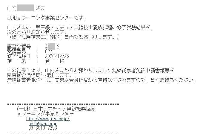 先日受けてきたことを書いた第3級アマチュア無線技士養成課程(eラーニング)の修了試験の続報です結果は1週間後にメールと郵送でということでしたが、仕事納めの28日に間に合わせてくれたのかメールの通知だけは到着しましたそれも嬉しい知らせです大丈夫だろうと感じていましたが合格の文字はやはり嬉しいですメールをキャプチャーしましたもしかすると、このメールが届いたということは、合格通知の書類の方も今日のうちに発送してくれているかも…なんて思っていますがどうでしょうまあ、免許の申請書はすでに提出済みなので、あとは免許が到着するのを待つだけなんですけどね12月9日に第3級アマチュア無線技士養成課程(eラーニング)を申し込んで27日に合格通知を頂いたので実質18日で終了できた感じですね(修了試験の日程があればもう少し縮んだかもですが)というわけでとりあえず第3級アマチュア無線技士に離れるみたいだよ…と言うお話でした