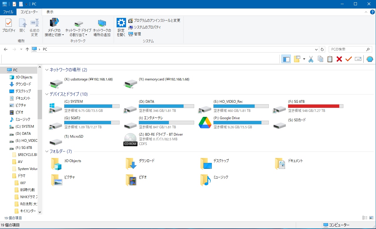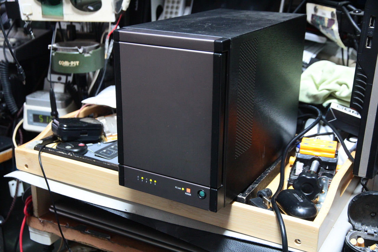 久々に引っ張り出した…ドライブドアSATAボックスUSB3.0 RAID 5BAYの続きです(^^ゞ先日チップの放熱を改善させたのと、状態が怪しいHDDを抜いてやることでそこそこの量のコピーをやらせても落ちなくなったので本格的に使うことにしましたで、5台分ものスロットがあるので…今までそれぞれでUSB3で繋がっていたHDDをまとめてしまいましたこのキャプチャーは先日8TBを追加したときのものですがこんな感じで8Tが2台、2Tが2台と1TBと言う構成で5台が外付けになりましたさてこのバカでかいBOXをどこに置くか…サブPCのモニターの後ろしかないよな~…昔からの配線がゴチャゴチャで大変そうなんだよな~……やるしかないか~とりあえずサブモニターの後ろにあったガラクタたちをベッドの上に(^^ゞ…こうなると、片付くまで寝られません(^^;なんとかつじつまを合わせて…なんとかBOXを置けるスペースを確保…片付いたとは言わない(笑)真ん中に居座っている弁当箱にはスマートリレーが入ってますのでBOXを落とし込む間避けることは出来ますが、あまり動かせないんです(あちこちの電源をまとめているので自由が効かないだけですが)ということで、なんとか収まりました\(^_^)/裏のゴム足が全く無かったのでこんなものまで買ってしまいましたで、ディスプレイを戻してやれば完成~なんかBOXが傾いているような…BOXの下をHDMIケーブルが通っているので傾いちゃいました…もう少し背の高い足にすれば良かったかな~まあ下駄を履かせても良いかななんとかベッドの上も片付いたので寝られそうです(笑)ということで、HDD Boxのジャンクで買ってから数年越しで正式に使おうとしているというお話でした