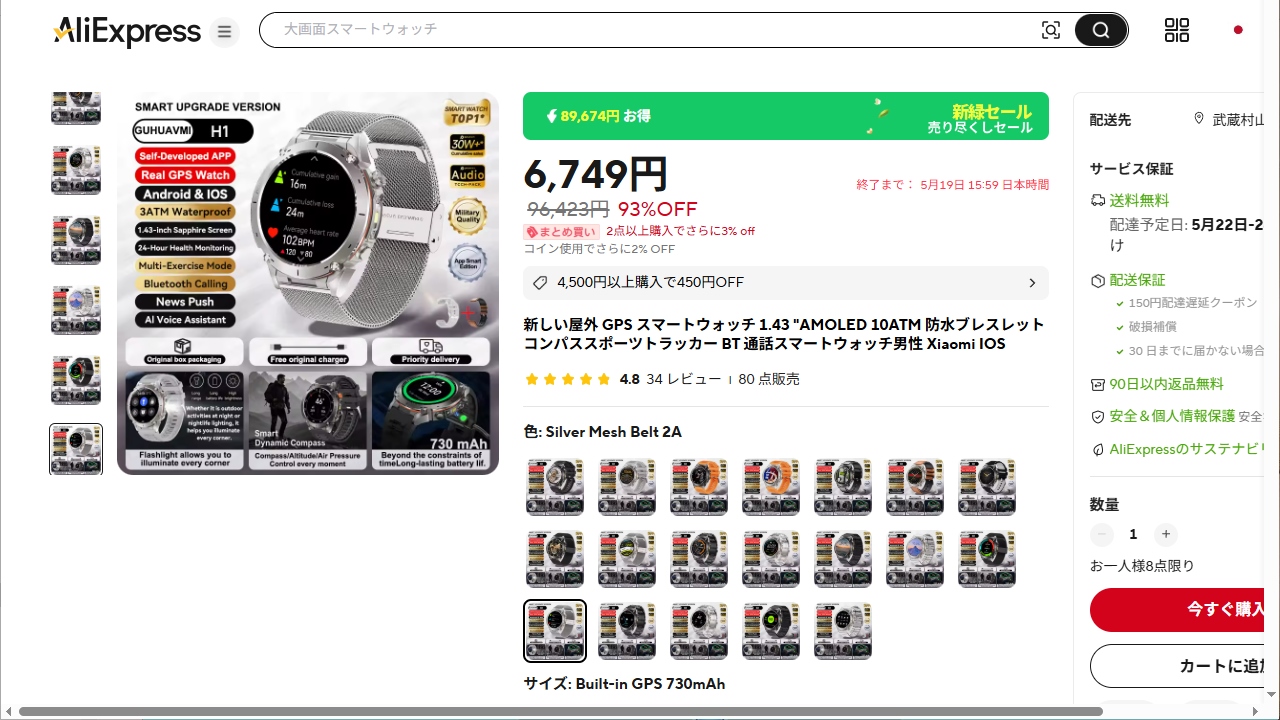 スマートウォッチは通話ができるという物を買って使い勝手が悪くて結局TalkBand B6を買ったのが2022年07月で以来それを使っていますただ、最近は安いやつでも10ATM防水なんていうのも出てきていてしかもそれほど高く感じない…ので、怖いもの見たさで一つ買ってみました購入したのはこちら…AliExpressで売っていた新しい屋外 GPS スマートウォッチ 1.43 "AMOLED 10ATM 防水ブレスレットコンパススポーツトラッカー BT 通話スマートウォッチ単体だともう少し安いのですが、替えのベルトが2本ついているものを選択して支払額は6,628円でしたで、注文から10日ほどの昨日到着しました外箱も潰れなどなくきれいです例のグレーのビニール袋で到着しましたが、プチプチのおばけみたいな頑丈な緩衝材でくるまれていました…日本人としては「外箱も商品の一部」ということが少しは理解されたのかな中身を取り出すとこんな感じ予定通りベルトは銀のメッシュ茶色の合皮グレーのシリコン製の3種が箱の中に放り込んでありました…もうちょっとだね(^^ゞ時計本体は大きいし分厚いですよ~まあ、表示面の直径で40mmくらいありますのでね※薄っすらと見えているウォッチフェイスは常時表示用のもので省電力なデザインですそれなりに色々表示されているウォッチフェイスで点灯してみたそこそこ解像度があるのでアナログの長針の描画も20秒ごとで結構細かいまだ手洗い程度の水しかかかっていないので防水性能はわかりませんがつけっぱなしで風呂に入ってみようと思っています…風呂のお湯というのは考慮されていないというのが常識ですが馬鹿みたいにバチャバチャやらなければプールの水泳と変わらないと思いますそれを何回かやって水が入ってしまうようなら、返品します100m防水を謳っていますからね~自分で選んだ写真をウォッチフェイスに出来ます…Wアグネス(^^;写真はスマホの中にあれば何でも自由に選べますが時計表示に関してはこれだけ…表示位置が上か下かをを選べるだけです時計表示の方も内容を少しでも選択できたらもっと良いのにね~ただ、TalkBand B6でも写真を貼るウォッチフェイスでは同様だったけどねガラス面は真っ平らで、それなりの強度のものが使われているらしいけど…直径 39mm ガラスフィルム 【3枚セット 日本旭硝子製素材 】これを買って、例によって捨て貼りをやりながら貼り付けておきましたとりあえず、スマホアプリとの連携も終わって、昨日夕方にバッテリー満タンからつけっぱなしにしてますが、今のバッテリー残量は80%と言ったところです…週1程度の充電で済むならとっても楽なんですけど、どうなるでしょうね~ということで、防水性能が高いことを謳ったスマートウォッチを買ったというお話でしたP..S.別ネタがあります…夜ふかしのハイ状態も手伝ってとんでもないものを注文しました到着は5/18の午後ということなので、到着したら紹介します…コムスに積めたら良いんだけど、場所がないんだよな~