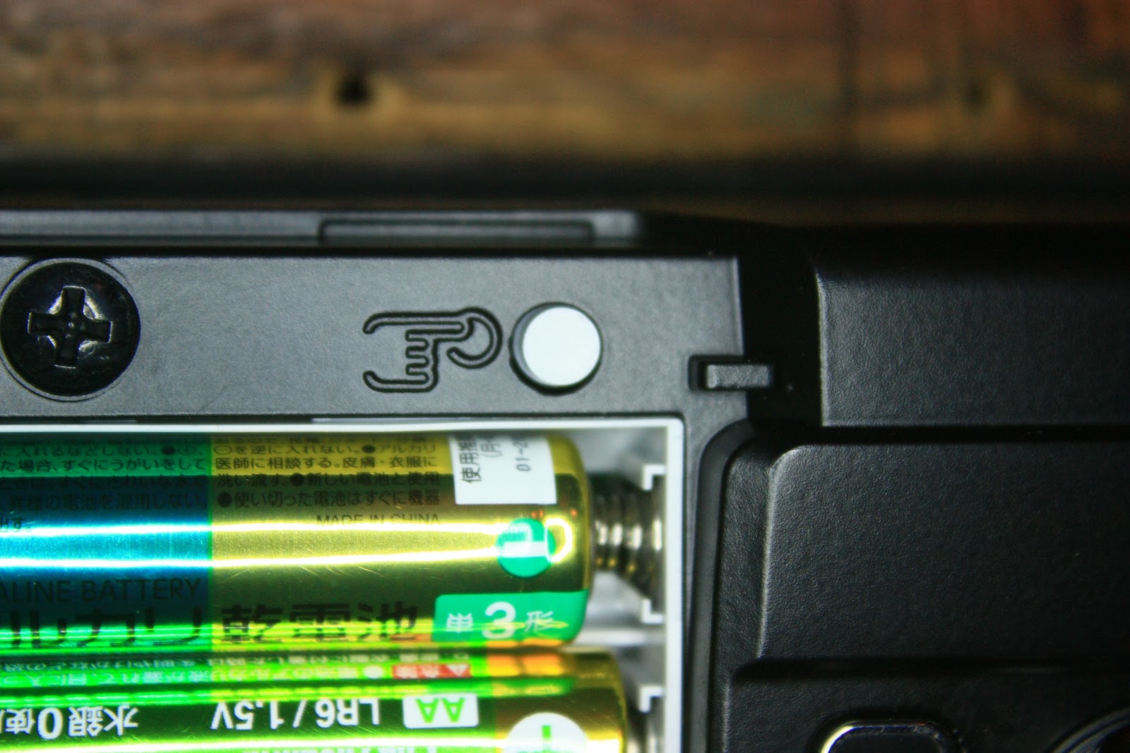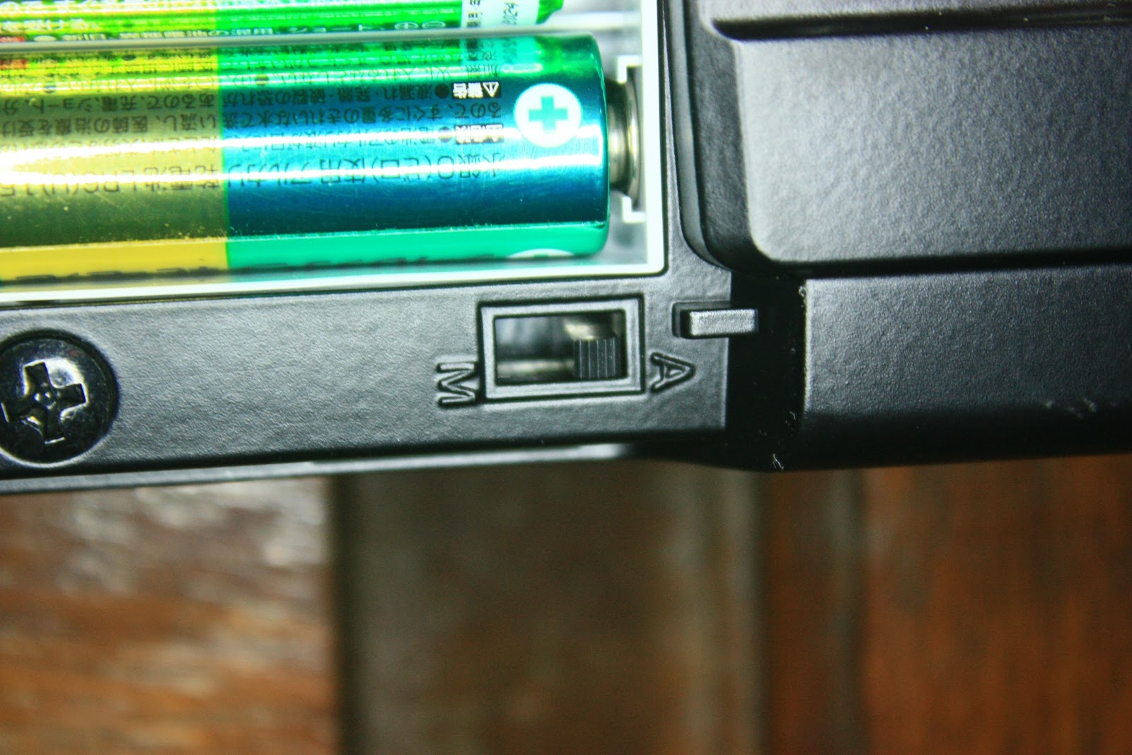 電池の上あたりの白いボタン、下側にはスライドスイッチ