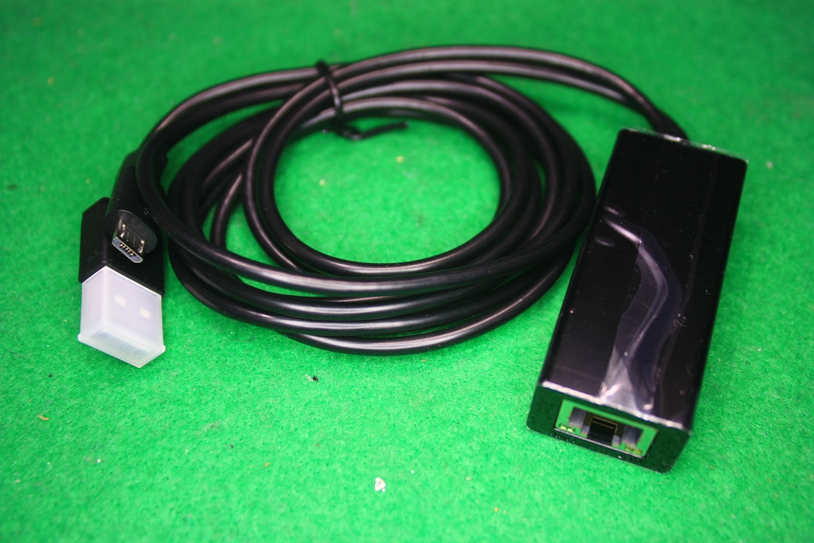LAN端子のあるBoxから電源用の標準USBとGoogleCastにつなげるMicroUSBコネクタの