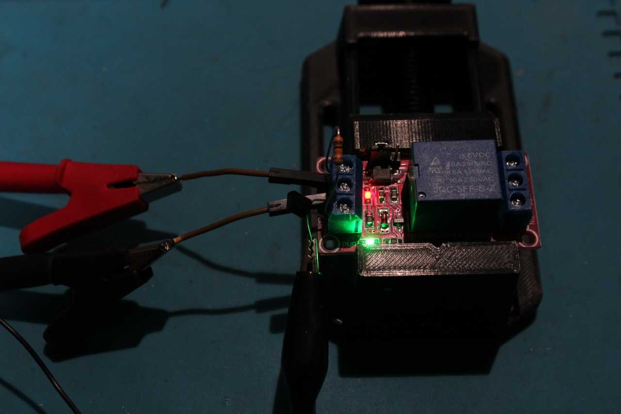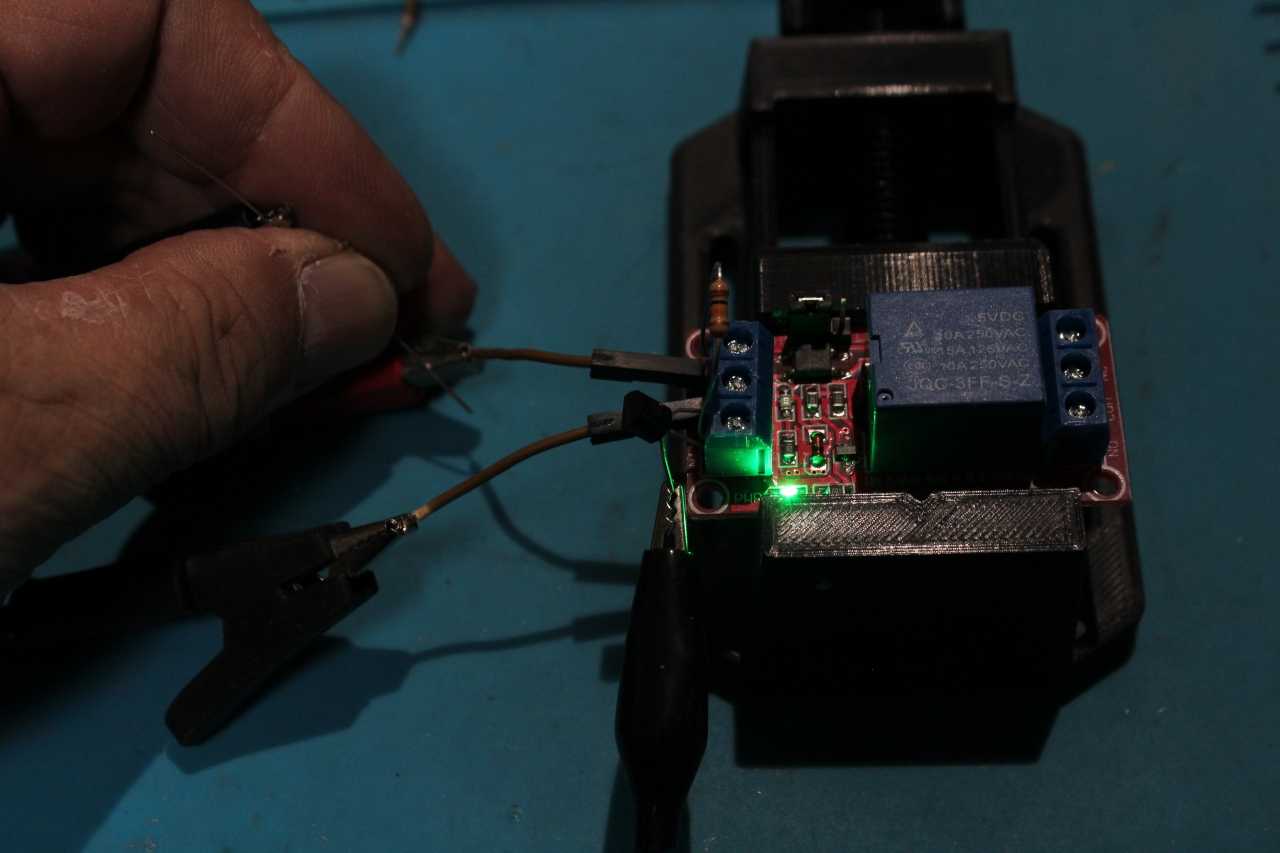 緑のLEDは電源表示で、赤が点灯するとリレーがオンの状態