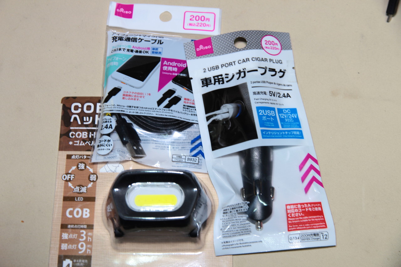 COBヘッドライト・アンドロイドiOS兼用ケーブル・車用シガーアダプター…全部ダイソーで購入