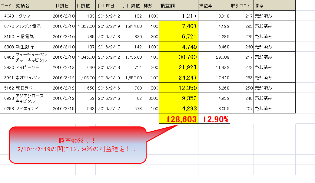 スイングトレードの状況です。全銘柄売却しました!!6営業日で約13%の利益確定しました!!今まで、このスイングトレードの平均利益は4~7%で、しかも2007年~2013年位まではろくに機能しなかったので非常に感慨深いものがあります!!2006年くらいから逆張り系のスイングトレードしていた人にとっては非常にうれしい結果が出たのではないかと思います!!