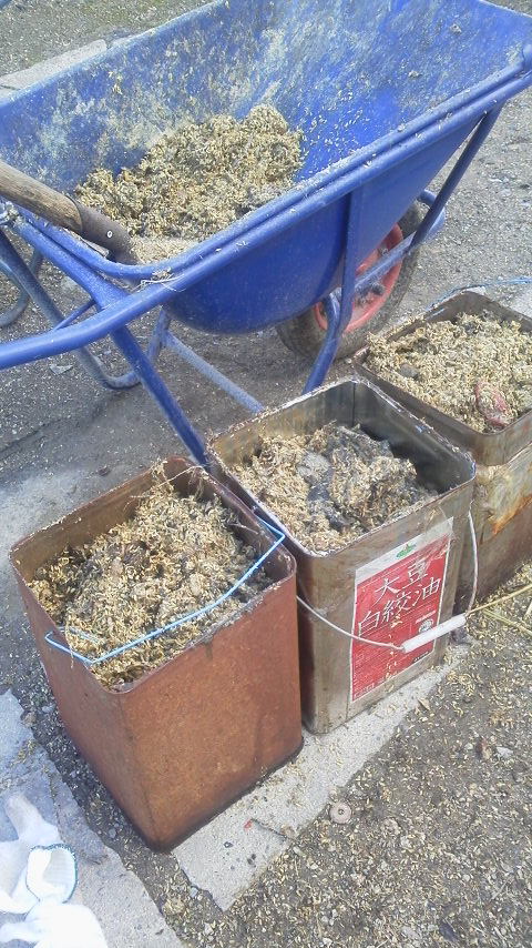 寒い日が続いているが、今年の12月の最低気温はまだ0度にはなっていない。 自分の記録によれば、昨年は12月6日から8日間最低気温0度が続いた。 夏から平均的に暖かいからちょっと寒くなると、「今年は寒い」と感じるのだろう。 爆弾低気圧の北西風が吹きすさぶが、1週間ぶりに生ごみ堆肥の充填を行った。生ごみを腐らせて、腐敗で出た汁を水醗酵槽に取り、残りの固形物に籾殻、米ぬか、廃食用油を加えてよくかき混ぜて、20リットルの缶に充填し、送風のタンクに並べる。 20リットルの缶の底には全面に小さい空気穴を開けて、送風機から空気を送る。 生ごみの中の好気性菌が働いて、生ごみの有機物を分解し、ほぼ4日ほどで堆肥になる。 醗酵の時、発行熱が出、温度は70度近くにまで上がる。そのため出来た堆肥は完全に乾燥した状態になる。 今日ダイキへ行ってブラブラ物色していたら、以前から探していた深い発泡スチロールの箱が見つかった。この中に50度ほどの湯を入れて、ペットボトルに入れた液体酵素力を浸してふたをすれば一晩は液体酵素力が凍らないですむ。 廃食用油と酵素水から製造した酵素入り石鹸(酵素力)は非常によく汚れを落とすが、液体にした酵素力は気温が6度を下回ったら凍る。 この凍るのを防ぐために湯煎をしていたが簡便なものを探していた。やっとあった。