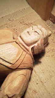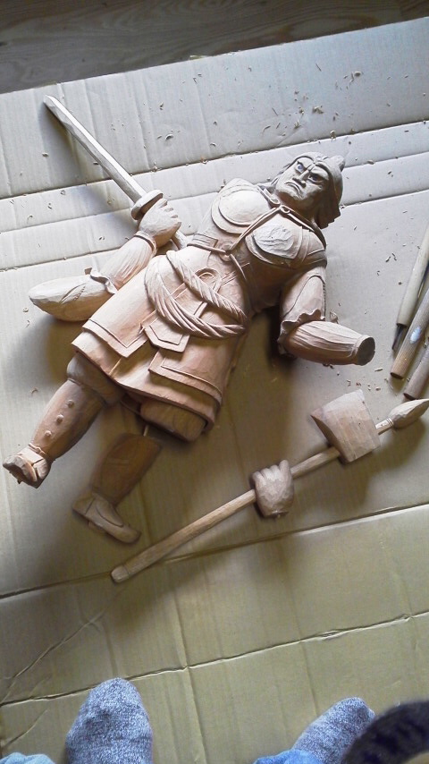 不動明王の火炎光背の彫りを継続中だが、作業台の上にだいぶ前から乗っけてある壊れた持国天が早く何とかして欲しいとにらまれているような気がして、今日から修理開始。 持国天はもともと11年前に彫って、自宅の玄関に守護神よろしく鎮座していた。 北方守護神である多聞天、西方守護神である広目天、南方守護神である増長天と4体をほぼ同時期に立て続けに彫ってそれぞれ北京総研へ、高橋君へ、弟へ贈呈して持国天だけが残っていた。 2年ほど前に買い物から帰ってビニール袋を持って玄関から入って持国天の側を何気なしに通ったときビニール袋が持国天の右手に当たって、「あっ」と思ったときには廊下へ前のめりにドカンと倒れた。 倒れた拍子に右手と左腕、足、天の邪鬼がそれぞれバラバラ。 この4体は胴体、腕、足、持物、天の邪鬼とすべて部品に彫って接続して造形している。 丁度父親の葬儀のあとで、なかなか修理できずに作業場へ放置していたものだ。いざ修理を始めてみたら、作ったときには完成だと思っていたのだが、いかにも彫りが甘く、もう一度手を入れなければ納得できそうにない。 早速今朝から彫刻等での整理開始。 完成までに時間がかかりそうだ。棚には彫りかけたままの大日如来が何とかしろよとまだ目もついていないのににらんでいる。 彫刻刀、鑿も研がなければならず、バクテリアの世話もせんとならん、忙しい。