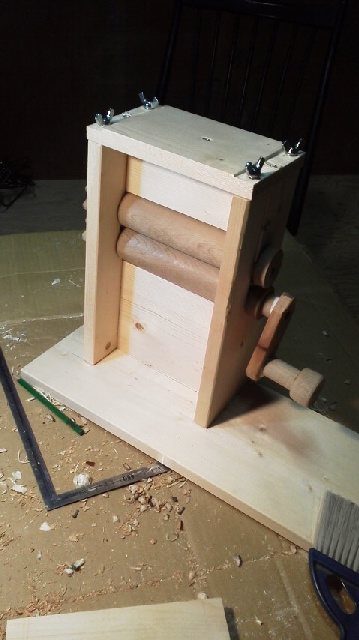 1週間かけてやっと完成した。見てくれは非の打ち所がない。 勇んでテストをおこなって・・・ガックリ 最初は順調に回っていたが綿の種が来ると、とたんに止まる。 種を取り外すとまた軽快に回る。 そんなことを5回繰り返して、腹立ち紛れに握っていた綿の塊を思い切りぶつけた。 なんでー?十分に自信があったのに・・・気を取り直してもう一度挑戦するも敢え無くアウト。 じっくり観察すると、ローラーが種を引き込もうとしている。 ネットで見てみると、種がローラの上で踊っているように見えるが、筆者のは踊るまもなくローラーが引き込んで、回転が止まってしまう。 もっとじっくり観察すると、ネットでの綿繰り機はローラの径が小さい。親指ぐらいの太さしかない。 筆者のはローラの径が46mm、親指の太さなら28mm程度。太すぎるのだ。 もう一度やり直しだー。ガックシ。