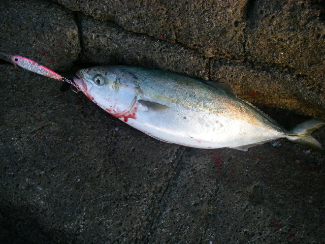 昨日(10/22)の夜に親戚のKさんから電話が有り夕マズメにバラシ多数で何とか1尾Getしたよ。と言う話しが舞い込んできました。このKさんは僕と年が離れれているんですが、小さい頃より色々教えてくれる兄貴的な人です。で、朝練確定です。AM5:30に目覚め薄暗い中出発。Pへ到着まだ、Kさんは来ておらず、貸切です。1・・・2・・投反応が有りません。続く3投目やはり居ました。イナ~~ダくん。引きを楽しみながら上がって来たのは前回より少し小さい42~3cmでした写真を撮って血抜きをしているとKさん登場。二人で並んでやっていると、先ずKさんにアタリでも惜しくもフックアウト。続いて僕に又アタリ同じ位のをGetです。Kさん魚に対してルアーが大きいのか痛恨の8バラシ。Kさんルアーを替えて1尾目Get。此処から群れの活性が上がったのか怒涛の入れ食いと今季初のボイルが起こりポイントは戦場と化してます正にカツオの1本釣りのようです少し大げさですが。写真を撮るのも忘れ帰宅時間まで頑張りました。結果はGet数5尾、アシストフックの疲労によるバラシ*1、フックアウト*1尾でした。1時間弱で5尾(自己新)と大満足な朝練でした。烏賊さんも気になりますが、コヤツ等の活性が高いのでもう少し先にやりたいと思ってます。あ~~ぁとうとう、ライトゲームの範疇から外れちゃったかも。