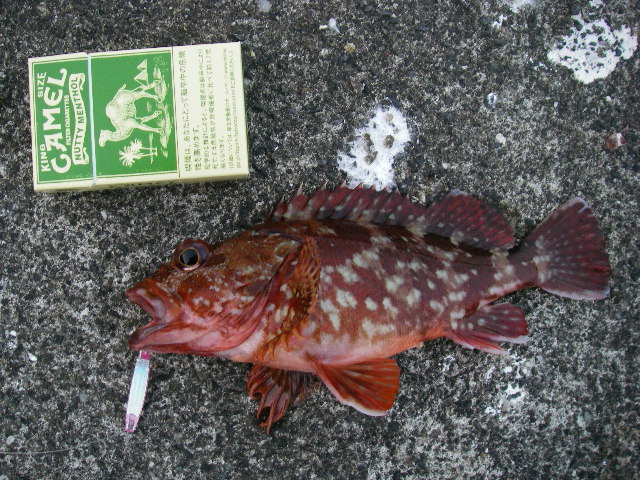 昨日、知り合いから『カツオと間違える程の大きいソウダが釣れてるよ。』『数も悪くて10本位で入れ掛り~~~』。と言う情報が早朝に舞込んで来ました。仕事が手に付きません~~~。何とか仕事を終えて、教えて貰ったPへ行くと何と遥か彼方に有る台風の影響のウネリが釣り座を洗ってます。仕方ないので安全なPへ切り替えて弓角&ジェット天秤をフルキャスト。気持ちい良い位飛んできます。しかし、このPで釣れてる情報は無く○ボ覚悟です。そんな時、着底から巻き始めると『ククン』と言うアタリが有り合せるとナカナカの引きです。底の方で掛かったので青物では無いな~~~と思いつつ寄せると案の定コヤツでしたカサゴ君でした。丁度、角が目の前通ったんでしょうね。外道ですが、○ボ脱出、えっ甘いって。この後、魚のアタリは無くて終了しました。久しぶりの魚の感触味わえて少しストレスも飛びました。