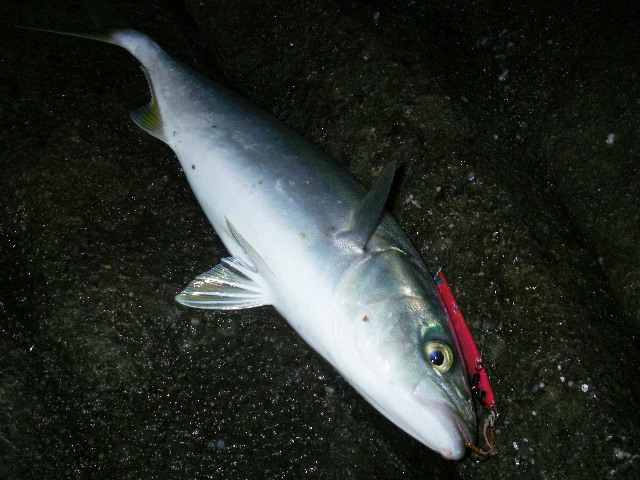 しつこい様ですが、今朝も朝練してきました。まだ、日の出前の薄暗い中Pへ。一番乗りで貸切です。緊張の第1投毎回何の釣りでも1投目が緊張します。着底からシャクリあげてホールさせると居ましたよ~~~。コヤツが昨日と同じくらいの42~3cmのイナダ君が。フラッシュたいたんですが暗くてスミマセンまたまた、1投目でHIT→Get出来て幸先良いです。処理して続く2投目、シャクッてる時にミスバイトそのまま棒引きしてると今度はちゃんと咥えたのでアワセを入れると掛かりました。2投2尾で気分はハイテンションです。爆の予感。しかし甘くはありませんでした。次の魚までが長い事。回遊魚ですから仕方無いんでしょうが。ストップフィッシング15分前に3尾目・4尾目をGetして丁度、帰宅を告げる携帯のアラームが....。本日の朝練は幸先良かったんですが、4尾と言う釣果でした。明日も雨が降らなければ行こうかな~~~。などと考えてます。因みに昨日釣ったイナダ君は嫁さんが大盤振舞いで配っちゃいました。太っ腹と言うか何と言うか。