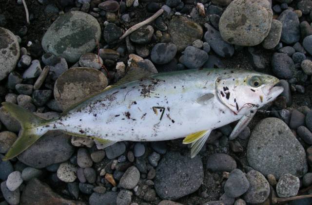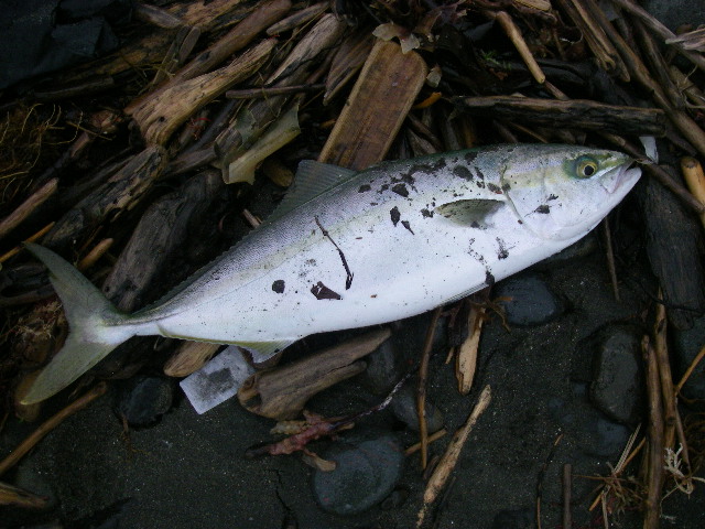 昨日・一昨日と振るわない釣果でブログ更新してませんでした。ソロソロ何か釣りたいと思いサバ君を撃墜しようかと思いサーフへ。ウネリも少し和らいで釣り易いんですが、サバの反応がありません。参ったな~~~と思いつつ前回知り合いがイナダを釣ったポイントへジグをフルキャスト。ホール中に『ググンッ』と言う本日始めてのアタリが。空かさずアワセを入れると良い感じに引っ張っていきます。楽しいゲームの開始です。寄せに入ると(この時点ではサバだと思ってました。)抵抗開始。抵抗開始するとドラッグが出て行きます。寄せてはドラッグ出されてを繰り返してます。もう、サバでは無い事を確信してファイトに集中で何とか上がったのは 角度を変えて人生初と成るイナダ君でした。少し大げさかな?。自作のアシストフックが片方切れてました。強化しなければ何気にリベンジ完了しました。いや~~楽しいです。ハマリましたよ。こうなると、ショアジギングロッドが欲しく成っちゃいます。此処へ来る皆さんの中でおススメなロッドって有ります。僕は今、シ○ノ A○-C906なんですが......。負荷ウエイトがもう少し欲しいかななんて思ってます。今のロッドがルアーウエイトのMax42g迄なのでMax100g前後のロッドが欲しいな~~~等と考えております。書き込み宜しくお願いします。
