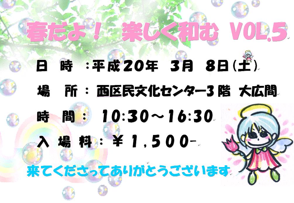 『春の楽しく和む』開催決定!!みなさま、どうぞよろしくお願いします♪ みんなでほのぼの過ごしましょう! 場所 広島市西区民文化センター(横川駅徒歩三分です。)開催時間 10:30~16:30以下出展の方の申し込み順です。みなさま、と~っても素敵です。☆OPEN Heart ペガサスyuki ハワイアンロミロミ 料金 5000円 LomiLomiとは「揉む・ほぐす」という意味を持つハワイ語で伝統的な ヒーリング療法です。オイルを使って心地よく心身を トリートメントしていきます。今回はご希望の箇所を一部分させていただきます。 newカードリーディング 5000円☆Healing Space Cynthiaアストロロジー 40分 4,200円 生まれた日の星には、あなたのブループリントの 情報ががたくさん散りばめられています。 あなたの才能や人生のテーマを紐解いてみませんか。 出生時間が分からない方もミニコンサルができます☆しまうまネイル ネイル(カラーアート込み2500円) ハンドマッサージ(15分1000円) 絵葉書 1枚500円ネイルや絵葉書を通してみなさまに楽しいほっとするひと時を…☆☆OfficePOKO♪ ソース体験会 1時間 500円 11:30~ 15:00~ 2回開催予定です♪ パワーストーン(ペンダントトップ 携帯ストラップ ブレスレット )1000円~☆mo-guオリジナルオーデコロンを作成1本4000円(星座、直感で選んだ香りを調合) 手作りアロマクレイソープ100g2000円☆エンジェルセラピーとカードリーディング&ヒーリング 料金 2000円~3000円☆cabochon stone(カボションストーン) 超希少な手磨きのパワーストーンを展示販売をさせていただきます。 ぜひ、お手にとって素敵な波動を感じてください。 「楽しく和む」特別価格!でお届けいたします。 ホームページはこちらです:http://www.cabochon.biz/ パワーストーンは私たちを幸せに導いてくれます。多くの方々に そのパワーを感じていただき、お役たていただきたいです。 素敵な石たちを通して、まず自分自身を大切に愛することの大切さ を思い出していただければうれしいです。 山田佳樹トレーナー ♪ソース・ワクワク♪http://www.source358.com/ ☆大人気!菜緒ちゃんの死海のバスソルト 料金 1個 250円 大好きな菜緒ちゃんのバスソルトは浄化の力が素晴らしいです。 私はいつもたくさん買っています♪☆やまたくさんの美味しいやきそば 料金 1個 350円☆カラーセラピールームクリアーオザキユミコ オーラソーマセッション 20分3名様限定 料金 3000円(ご予約してくださると助かります♪)↑その他時間は私は皆様の総合案内を顔晴ります よろしくお願いします♪たくさんの幸せが降り注ぎますように♪~~~~~~~~~~~~~~~~~~~~~~~~~~~~~~~~クリスタルターラ2周年感謝祭皆様、立春もすぎて新しい2008年が始まりましたクリスタルターラ2周年感謝祭第2弾のお知らせです ~~夢・発見日和り~~2/24(日)10時~17時クリスタルターラにて※内容 1.ミニソースコーチング13時半~15時 ¥2800講師:原田敬子先生~あなたの心の底からの充実感やこれからの夢を楽しくみつけていくセミナーです。~2.オーシャンカードセラピー 30分 ¥2800~自分発見ナビカードです。オーシャンがあたためてきたオリジナルカードです。3.チョキチョキペタペタ素敵な未来☆必見!オーシャン独自の夢宝地図セラピーです。未来から引っ張られましょう! 1回 ¥1500すべて要予約です。尚、今回の価格は感謝祭特別価格となっております。みんなで明るい未来に行きましょう☆オーシャン洋子〓