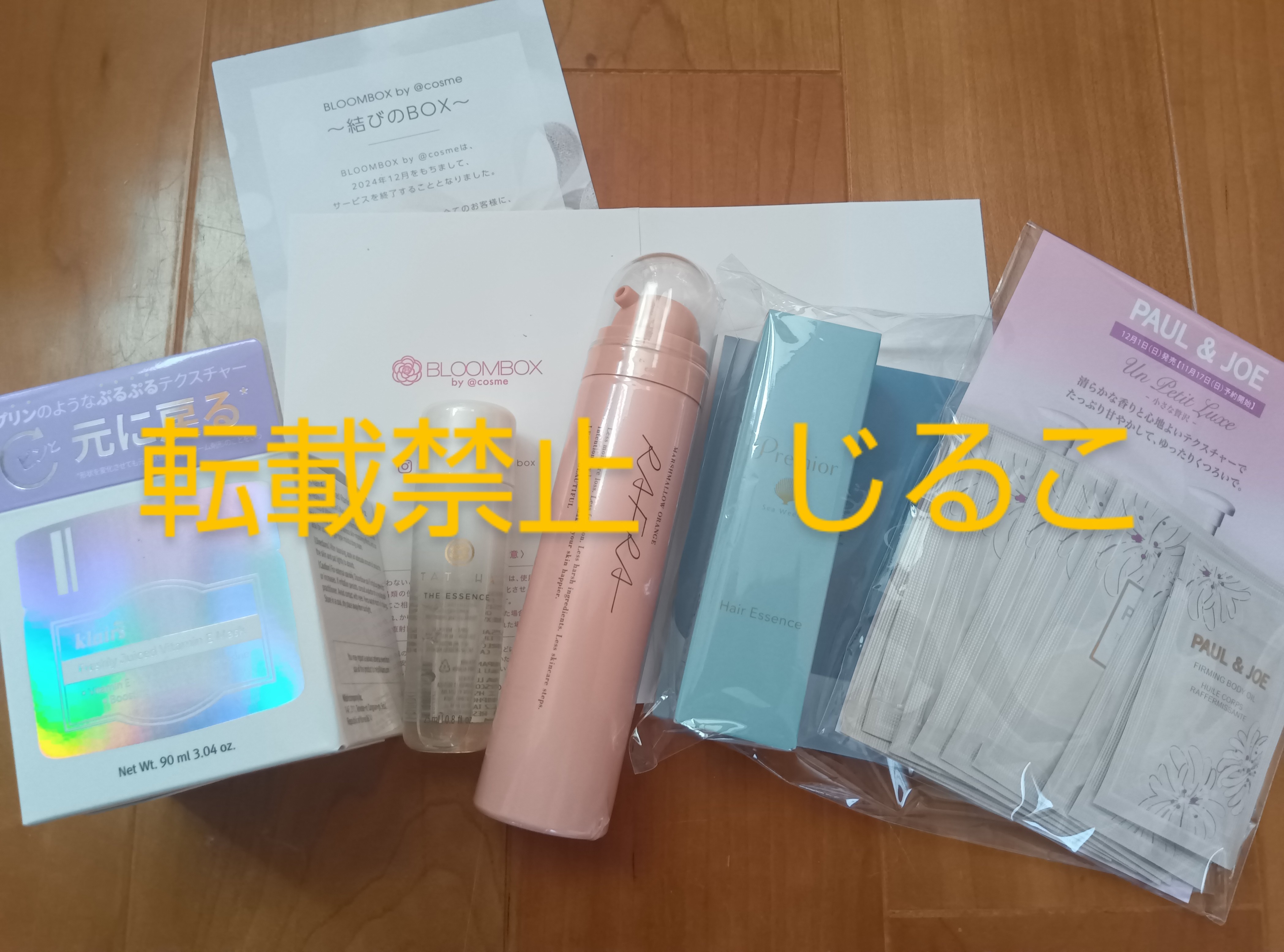 まあ、持った瞬間軽くてアレ?ってはなったんですけどね(笑)結びのBOX、とか謳ってたし…先に公開されてた品物見てちょっと期待しすぎちゃったのよねというわけでいや、まあいつも通りの内容だったし300円OFFクーポンもらってたので1,350円になったし文句つけるほうがおかしいんですが【28時間ポイント5倍!】 Klairs クレアス マスク 90ml 保湿クリーム クリームマスク フレッシュリージュースド ビタミンE マスク 美肌クリーム 弾力 韓国コスメ スキンケア 潤い ヴィーガン 毛穴 顔 ナイトケアクリーム 敏感肌 乾燥肌 Vitamin C Eおそらくメイン、現品前にこのブランドのビタミンC美容液入ってたなあつけると熱くなって怖かった記憶まあ使いますが「ポイント10倍 12月20日」 タッチャ エッセンス 本体/しっとり 150mL 化粧水 【送料無料】 アットコスメミニサイズですが、お高い美容液なので25mlサイズでも2千円くらいの価値のようこういうお高いコスメ試せるのが醍醐味でしたねぇ【全品ポイント10倍★12/26 1:59まで】「楽天1位獲得!簡単ワンプッシュで毛穴汚れスッキリ!」炭酸 泡洗顔 毛穴 ラフラ RAFRA マシュマロオレンジ 150g洗顔 ラフラ(RAFRA) 炭酸洗顔フォーム メンズ レディース 洗顔料テスターサイズ使うの楽しみです【楽天イベント限定!P10倍】ラサーナ プレミオール ヘア エッセンス(20ml/60ml/詰め替え用 60ml) | ヘアエッセンス ヘアオイル ヘアトリートメント 洗い流さないトリートメント ヘアケア 艶 ツヤ トリートメント 女性 髪 ダメージ アウトバスヘアオイルミニサイズとシャンコンサンプルヘアオイル溜まったのでじっくり使っていきます✨2024年12月1日 発売 国内正規品 PAUL & JOE BEAUTE(ポール アンド ジョー)スムージング ボディ ソープ 250mLポールアンドジョーボディケアセットサンプルポルジョ好きです♥メインが韓国コスメで…となってしまいましたが毎月届くのを楽しみに仕事や日々の生活を送れましたブルームボックス関係者の方々、(朝早く)配達してくれた佐川急便さん本当にお世話になりました!ありがとうございました🙇【福袋】マンデイムーンハッピーバッグ Winter/1個【おひとり様ひとつ 福袋 年末セール クーポン 2024 2025 スキンケア 化粧品 美容 セット 冬 ナチュラル オーガニック コスメ 化粧水 オイル 成分 エイジングケア 保湿 スキンケア成分 クリスマスコフレ】悩みましたが、スキンケアのセットにしました!オイルは溜まってるので…Dr.ウィラード 楽天限定 トライアルキット 3種類 ≪2週間分≫ 化粧水 ウィラード・ウォーター 70mL×1本 / スキンジェル 10g×2個 / モイスチュアクリーム 5g×2本 旅行 持ち歩き 敏感肌 乾燥肌 ウィラードウォーター drウィラード dr.willard waterスーパーセールで60%オフクーポン出てます!ウィラードウォーター、久々に使ったら荒れに荒れてた肌がおさまりました今無敵状態でブルームボックスでたまったコスメをつけれてます!Dr.ウィラード・ウォーター ダークコンセントレート 473ml (16oz) Dr. Willard's Water DARK Concentrate 16oz インナーケア スキンケア 飲む 美容習慣 ミネラル↑お風呂に入れたり飲んだり薄めて化粧水にしたりアイハーブでウィラードウォーター原液買えてた頃が懐かしい😭
