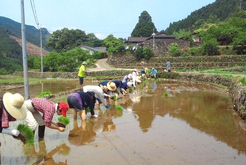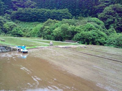 今年の田植えがほぼ終わりました。久木野っこクラブのもち米の田植えも無事終わりました。ただし、すべて終わったわけではありません。ほぼです。10日に熊本市内から20名ほどがやってきて田植えをする予定です。そこを10アールほど残しています。「Minamata color project」 が主催する、「合鴨田植え in 久木野」というイベントです。それと、水がなくて植えられない田んぼが1枚あります。ほとんどの田んぼは水路から水を引いているので水がなくて困るということはないのですが、一部の田んぼは沢から直接水を入れています。そんなところは沢の水が少なくなると田んぼに水が溜まりません。5月に入ってかなり晴天が続いていたので、沢に水もすっかり少なくなってしまっていました。でも、今日の雨でどうやら田植えができそうです。それに、「まるごと農場」で受託している田んぼももう少し残っていますし、合鴨のネット張りなどの作業もこれから。もうひと踏ん張りです。