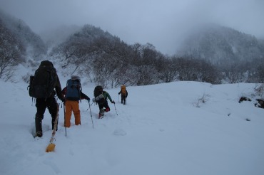 大晦日はパソコンの前で缶チューハイをがんすか飲んでいたやまやろうです。追加を買わなくてもいいくらい原信で買ったつもりだったのだが、深夜にコンビニに行ってしまったよ。年をまたいで飲み続け、昼まで起きられなかった。夕方までに嫁さんの実家に行かねばならない。山服の洗濯を急いで行い、山道具を片付けた。さて行くぞと思ったら、JRのダイアを確認すると1時間後であった、がっくし。もう少し本腰入れて片付けを行い、クルマ周りの雪をすかしておいた。魚津からちょっとした電車の旅。ビールでも飲もうかとも思ったが、前日に痛飲しているし、今夜もどうせ飲むのだから止めておいた。駅に着いたら嫁の出迎え。今夜はお寿司だー。山から下りてきて、最初に食べたいものの筆頭として、握り寿司が挙げられる。何でだろう、おそらく生ものが欲しくなっているのだろうな。目の前にたくさんあったから遠慮なくいただいてしまった。義理の両親、おじさん夫婦、義弟らと卓を囲む。飲み物はビールだ。ホンモノはうまいな。日本酒も少し飲んだが痛飲後には薄めがよい。ビールで通した。腹一杯になって、次男坊と眠る。山行初日での小ブナクラ谷の通過風景。デブリがあったので上部が気になるなー。