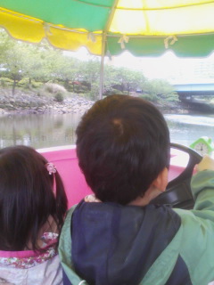 4人一緒に乗るつもりが、むすめが自転車の荷台でねんねしたので、やまやろうとむすこが先行した。彼のリクエストの黄色い船にした。