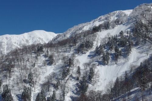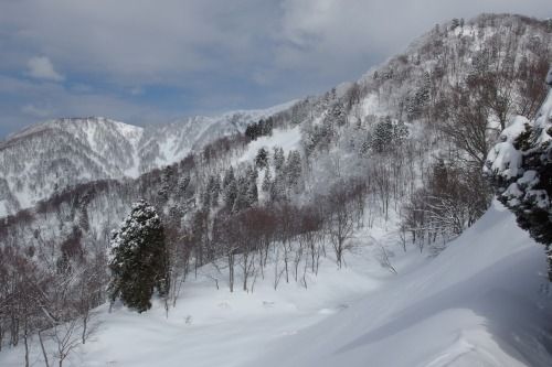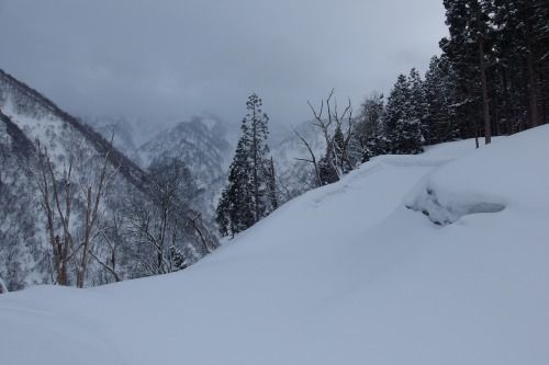 雪崩を警戒し、開けた斜面はなるべく通過せず、