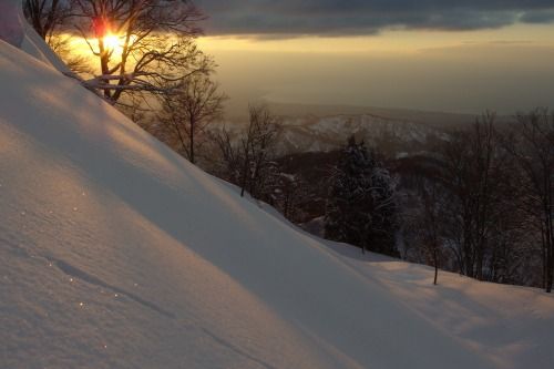 見とれる夕景。夕焼けに雪面がオレンジ色に染まる