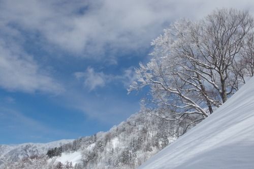 青い空に白い樹氷が映える。