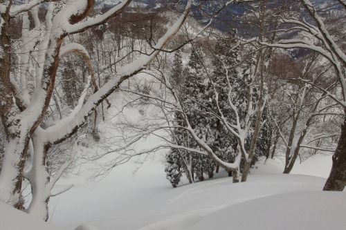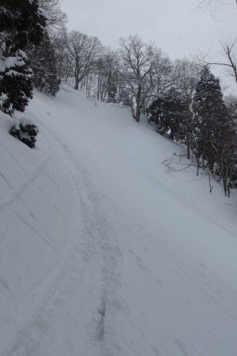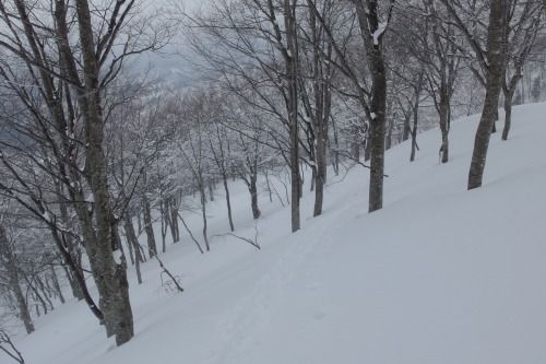 きたが、下りでは右手の潅木斜面を滑った。スギ林
