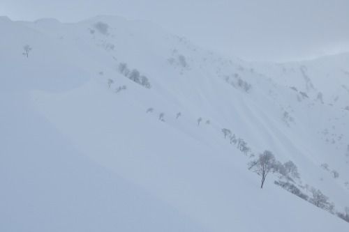 前僧ヶ岳斜面をトラバース中のワカン隊が見えた。