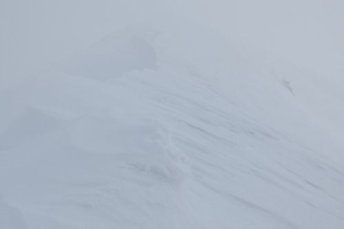 山頂が近づくと、新雪が飛ばされて硬い雪が出て