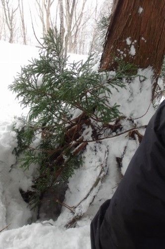 滑り損ねてスギ根元の穴に落ちる。頭を幹に打つ。