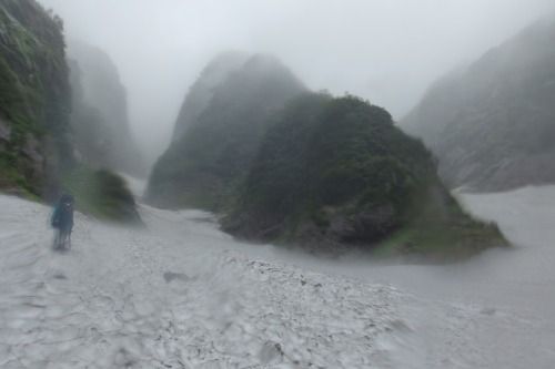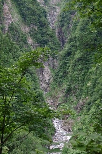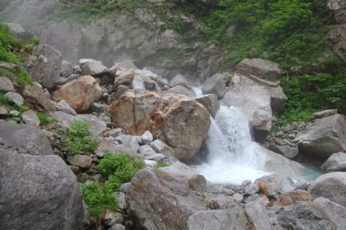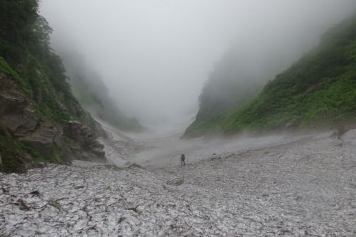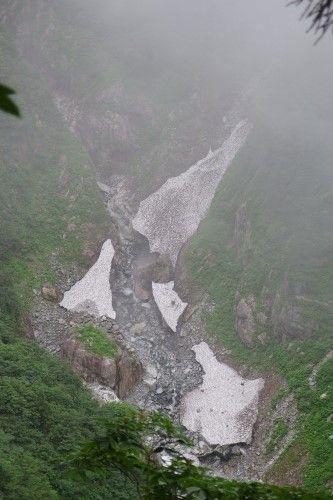 見えたV字谷、雪渓ズダズダ、巨石の滝。