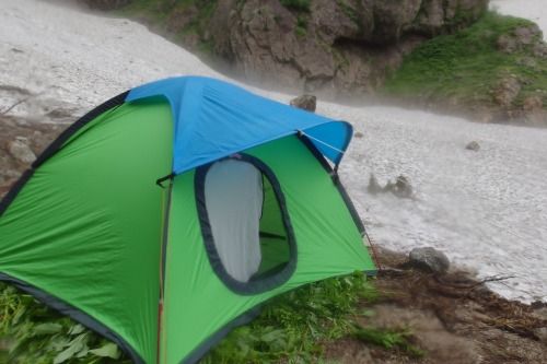 テントの外は霧雨。テントそばの雪溜まりから