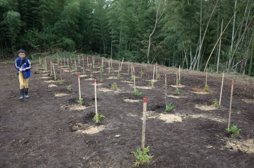 苗木に割竹が差してあるのは、草刈りの際に誤って