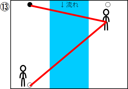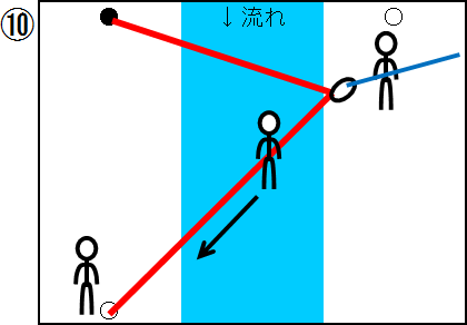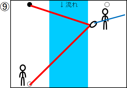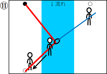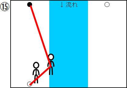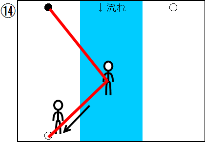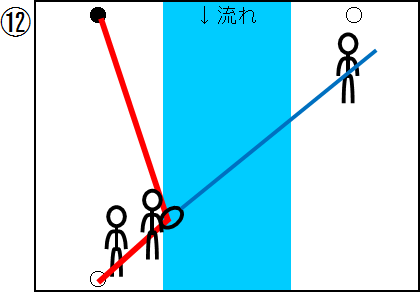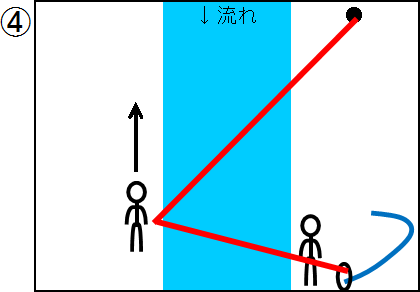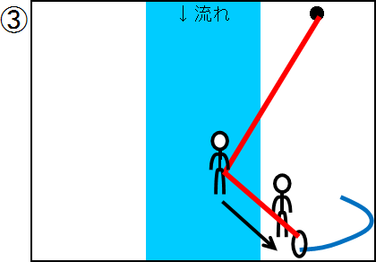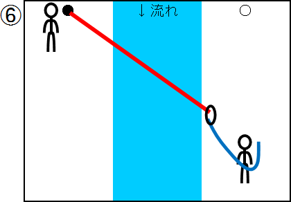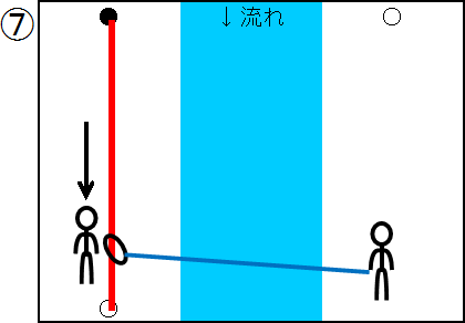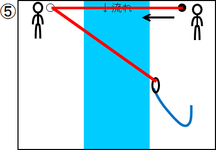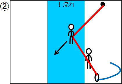 カラビナを掛けて、下流へ斜めに徒渉する。