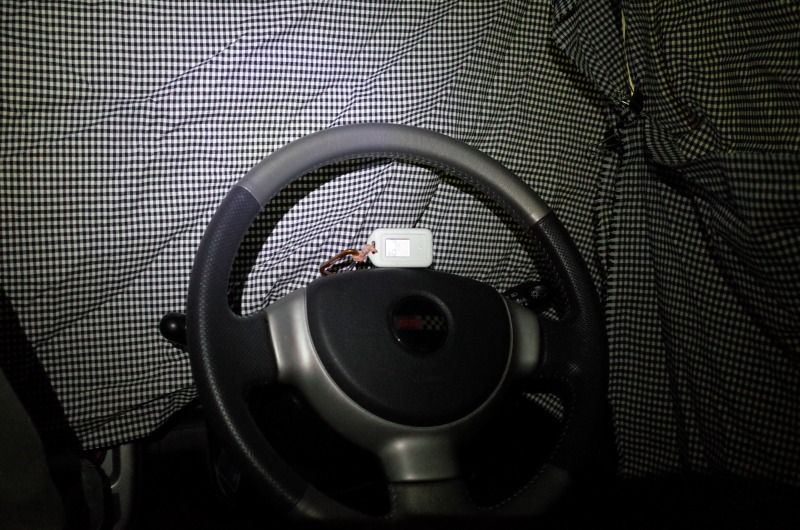ハンドル基部に温湿度計を置いて、車内温度変化を