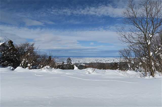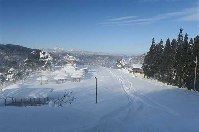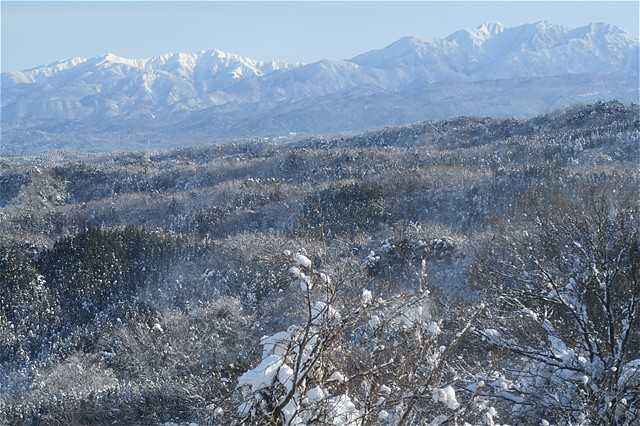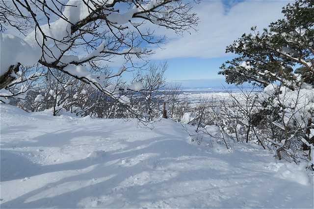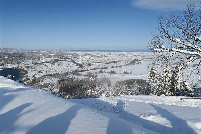 雪で真っ白な富山平野が見渡せる。