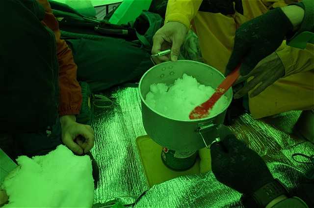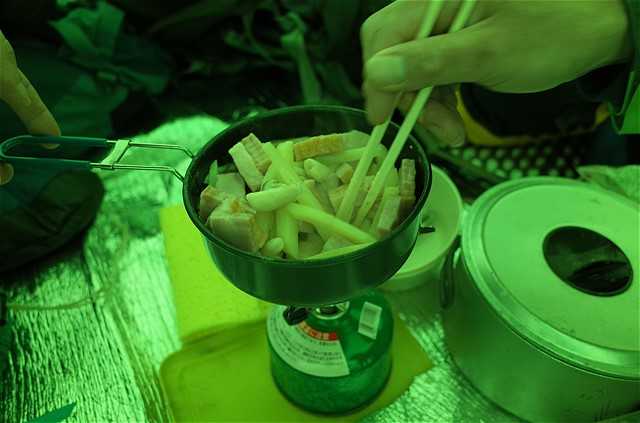17:35 夕食用の湯を沸かし始める。アルファ米(15分)が2名、カレーメシ系(5分)が2名。