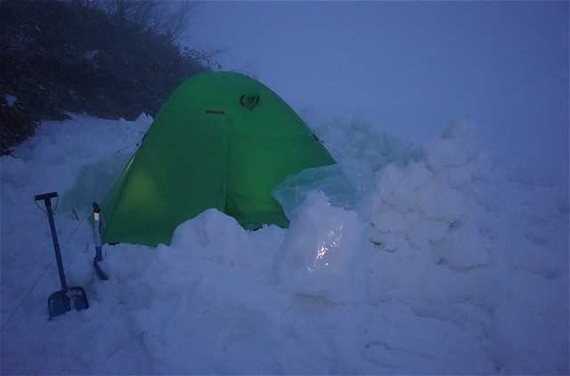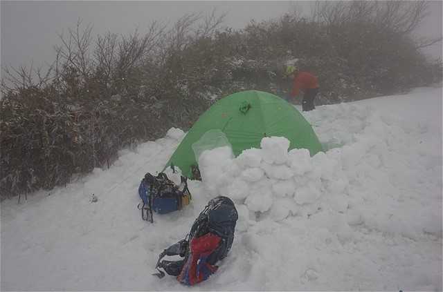 この幕営地はスマホ電波が通じる。生存確認のフェイスブック投稿。まあ雪が降っているから、早めにテントを張って正解だったと思うしかない。