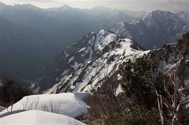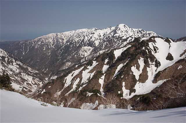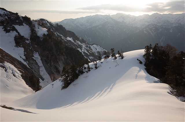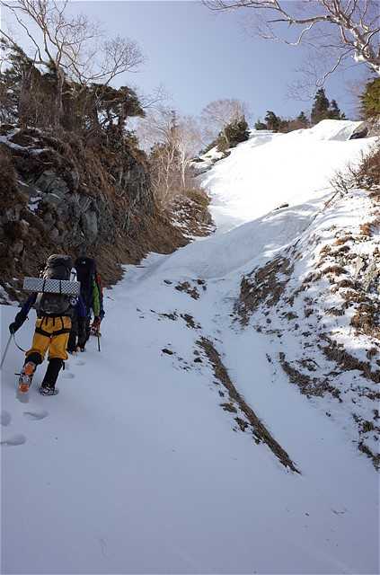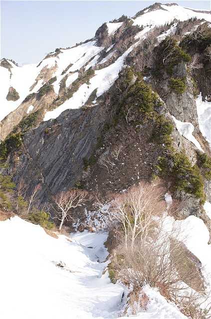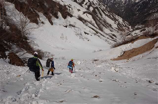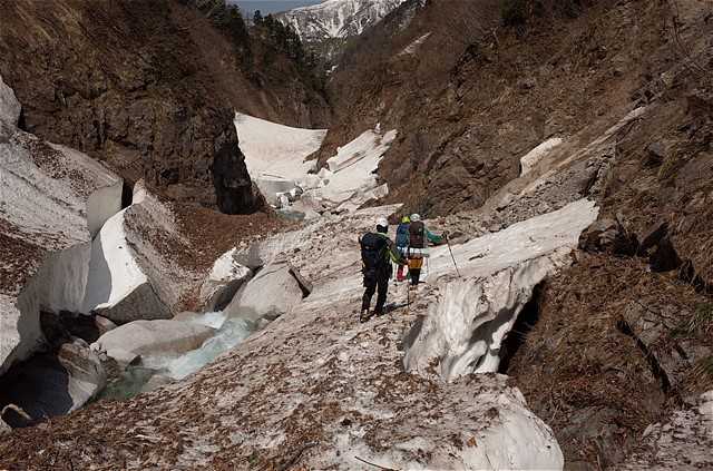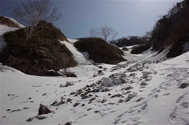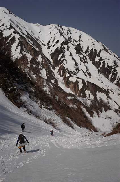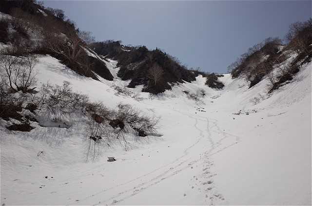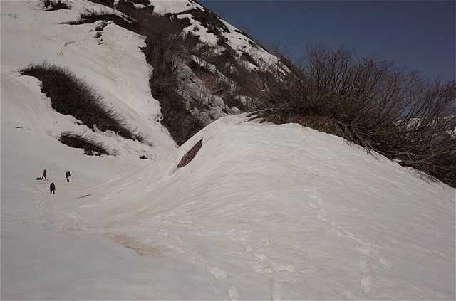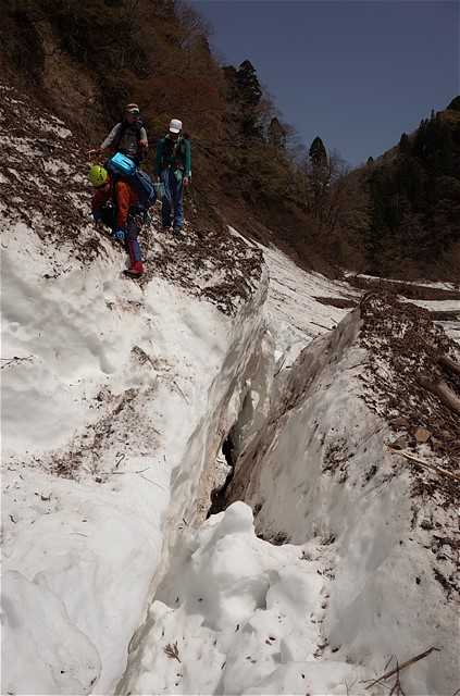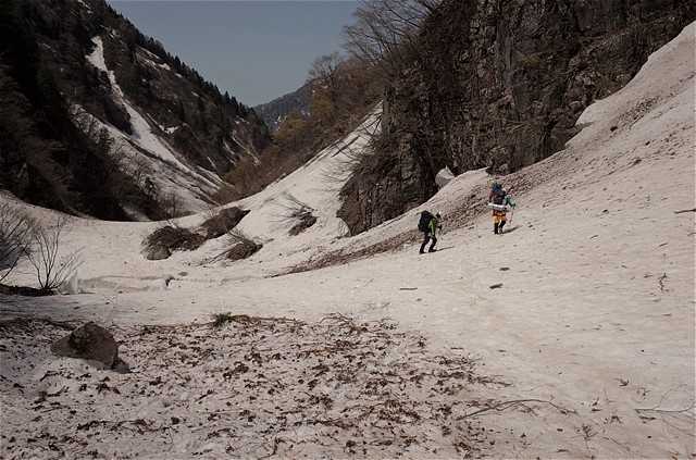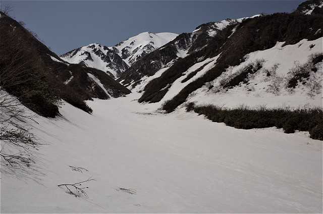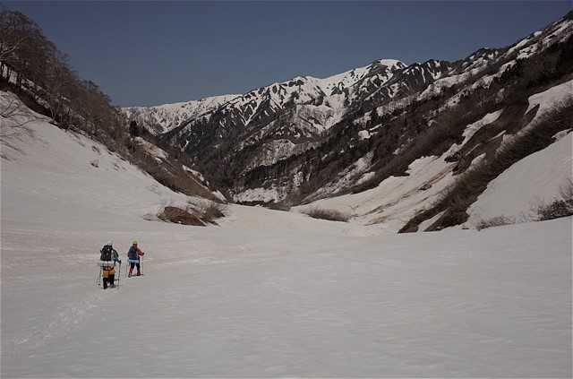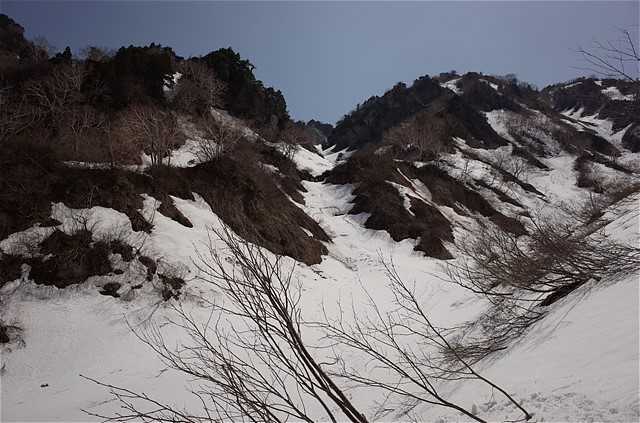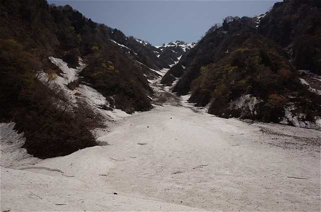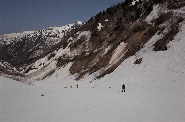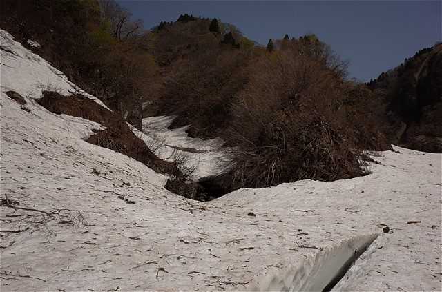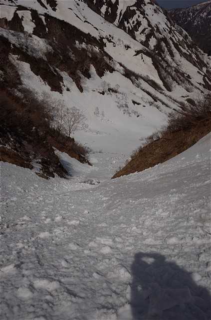 谷の下部は見えないが、平杭乗越に向かう時間はなさそうなので、どんどん雪の谷を下る。
