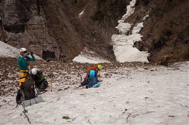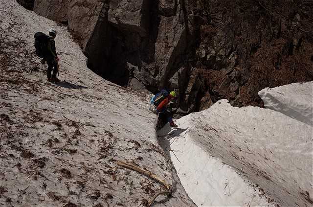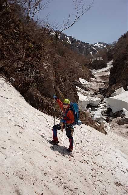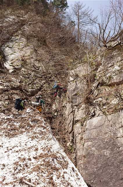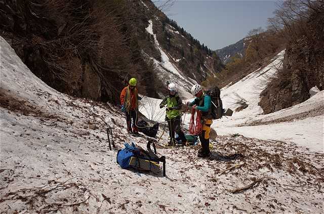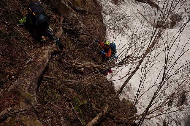 11:30 高巻き開始。残置ロープをゴボウして下降地点に上がる。残雪で半分くらいの高さか。