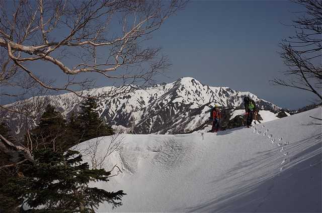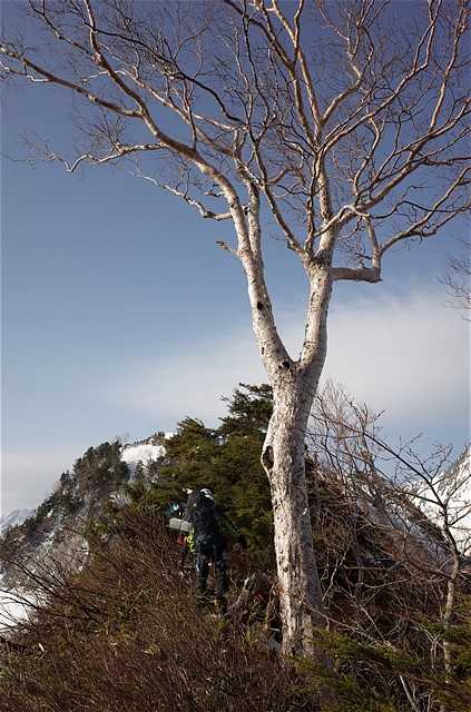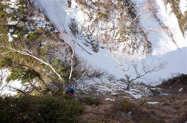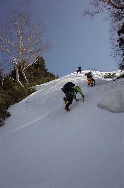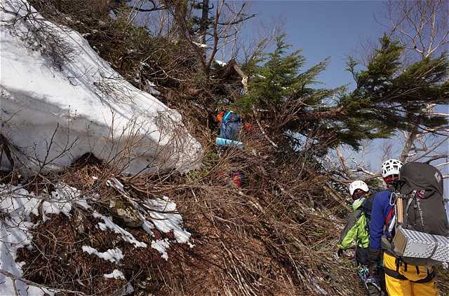 8:45 1880m ほぼ垂直に感じられた雪壁を登り切り、ウドノ頭のヤブ斜面に入る。