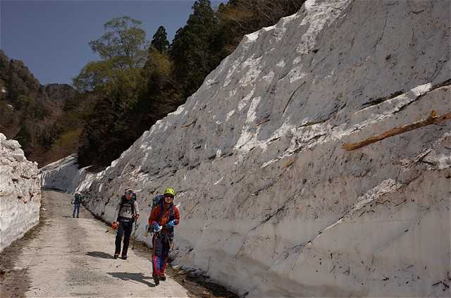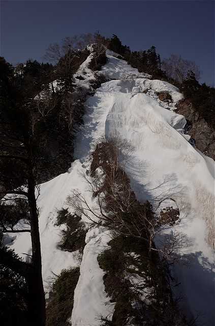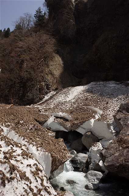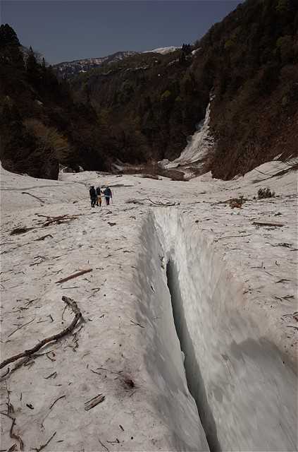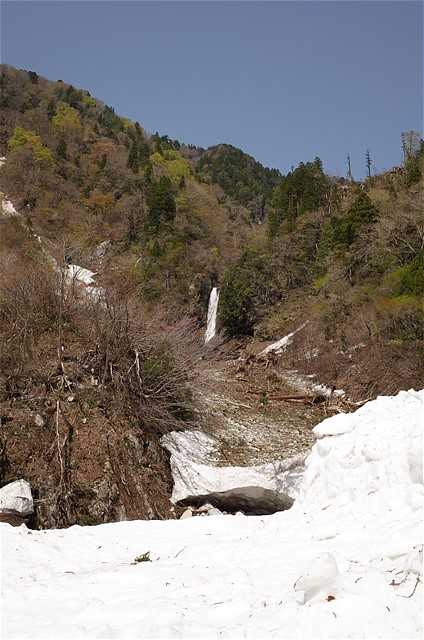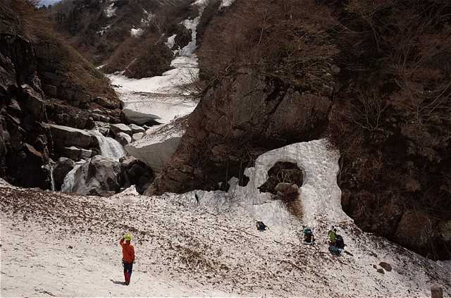 11:13 三階棚滝。滝上は雪渓がつながっており徒渉はない。滝つぼから吹き上がる風が強い。