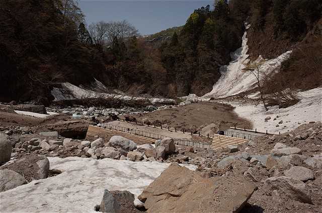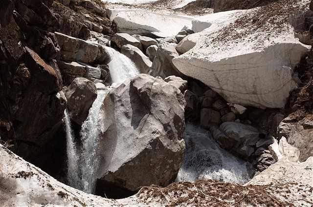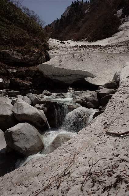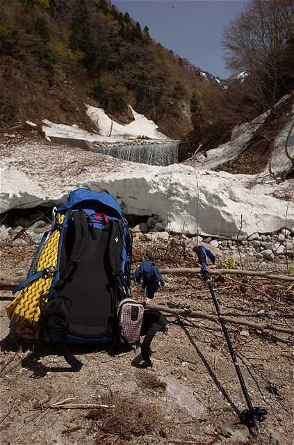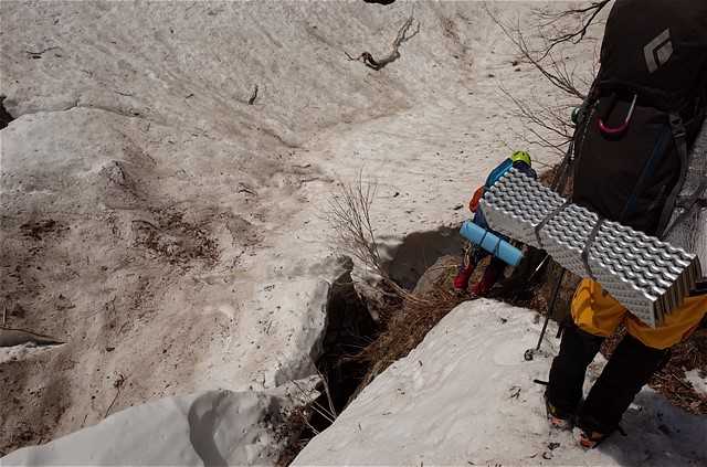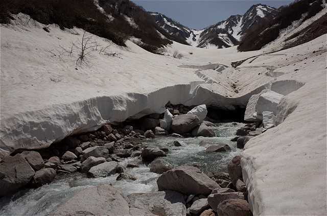 1264mまで下がると雪渓が割れて水が取れるようになる。