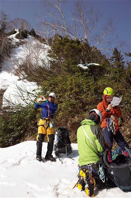6:04 1909m 出発。ヘルメットとハーネスを装着。入山3日目でピッケルを初めて使う(これまでダブルストック)。