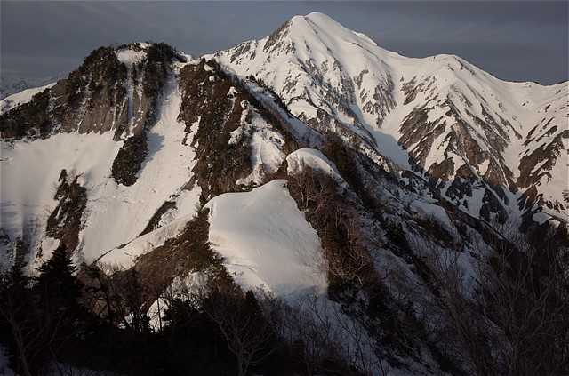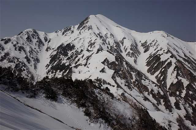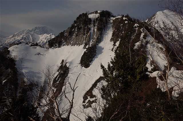 毛勝山の「天国の階段」に登山者、そしてトレースが見える。