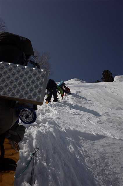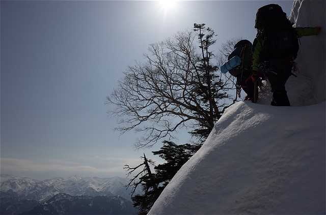 狭いリッジにバケツを刻みながら慎重に登高した。