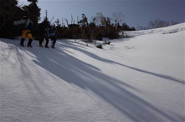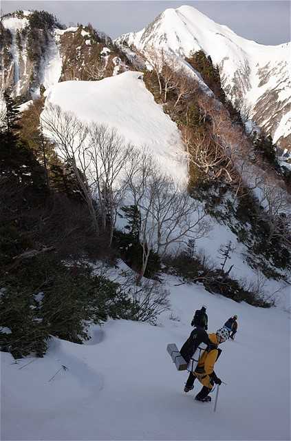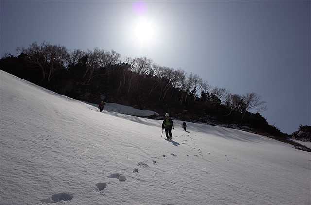 ヤブが濃い尾根通しには行かず、雪の斜面をトラバースしていく。